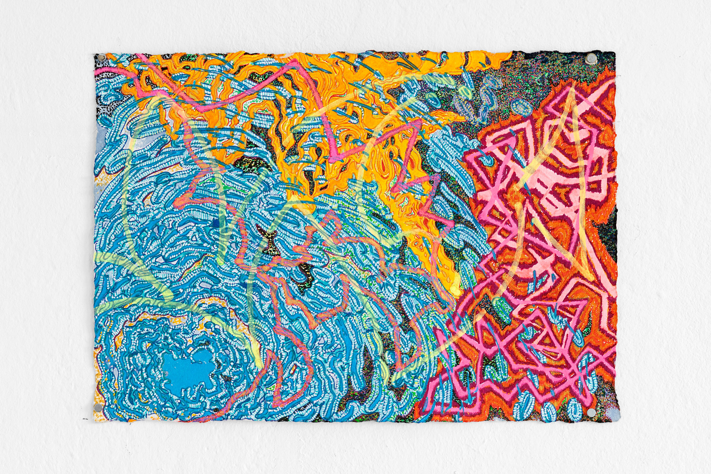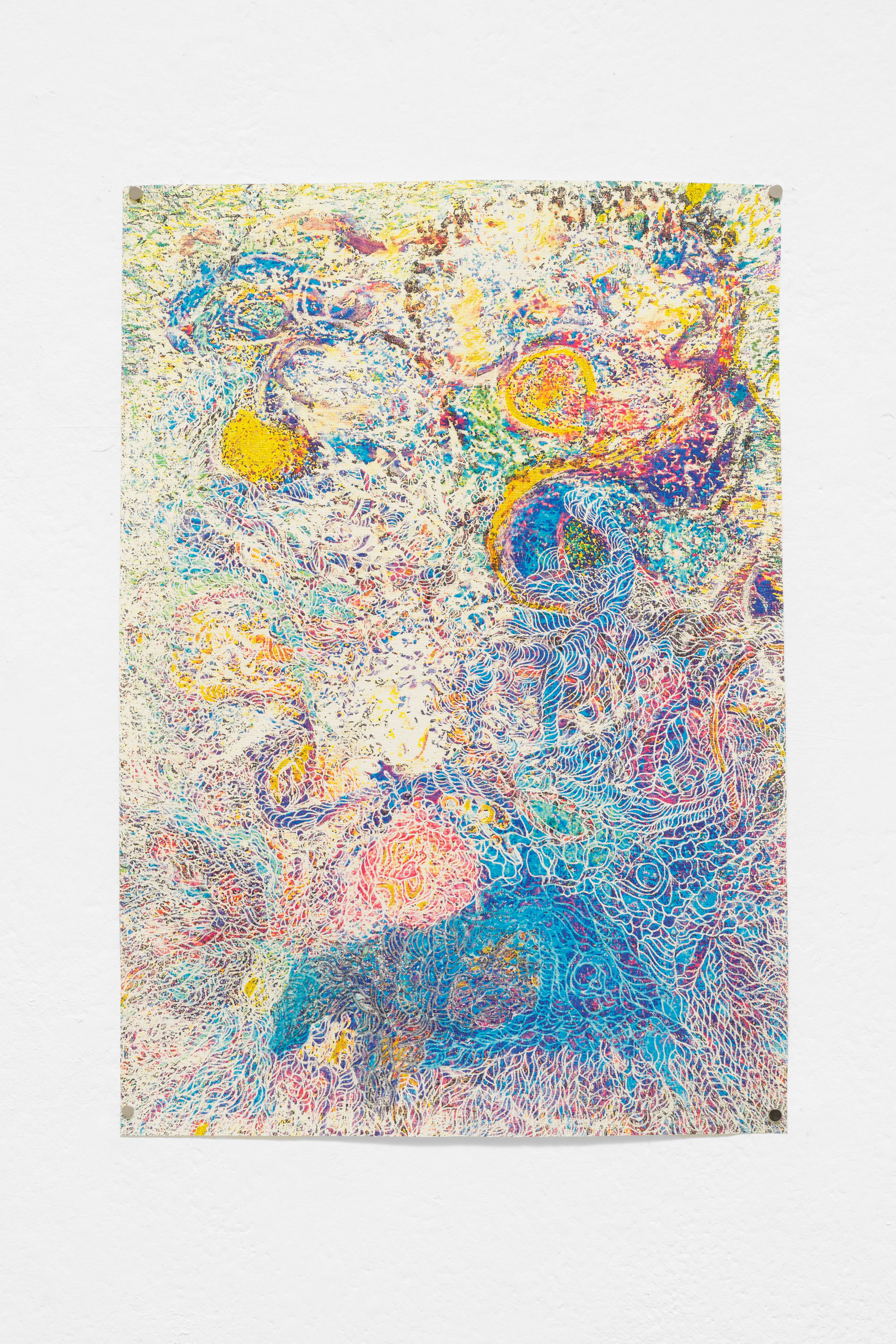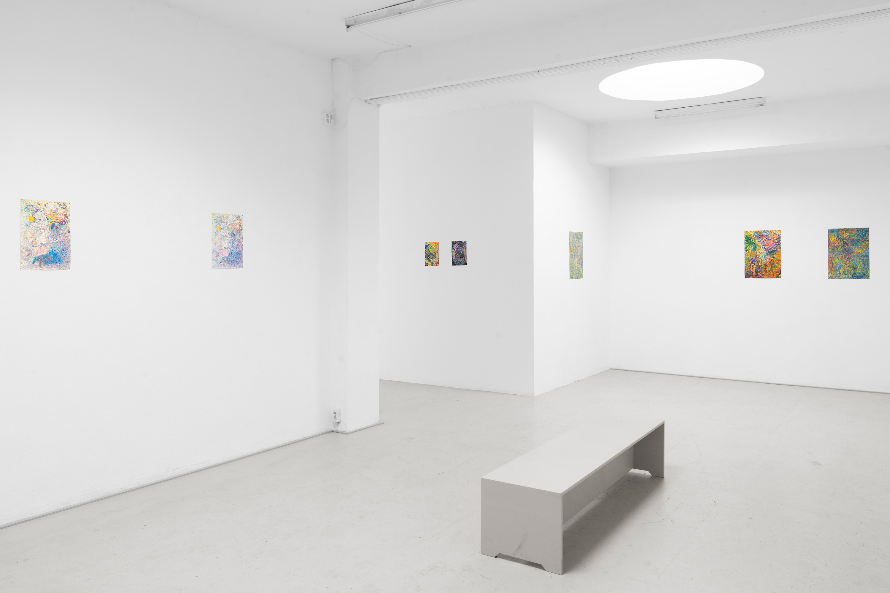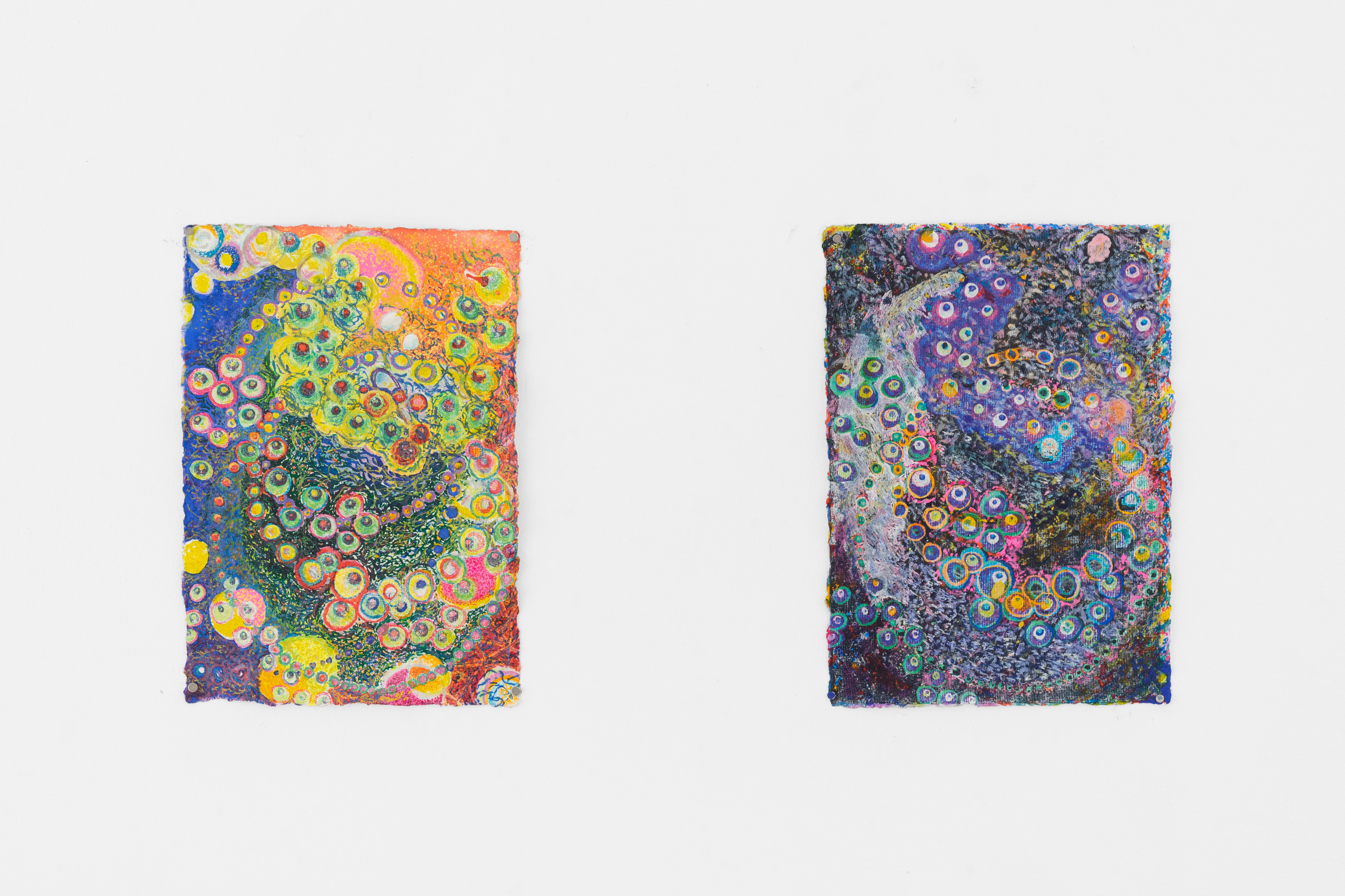 Während der fünfjährigen Zusammenarbeit von Kalbas und Teichmann entstanden mehrere Serien von farbigen Zeichnungen, in denen sich die Strukturen und Rhythmen auf unvorhersehbare Weise verändern. Die Blätter wurden während der Bearbeitung mehrmals ausgetauscht. Die organischen und ornamentalen Strukturen entwickelten sich so im Wachstumsprozess.
