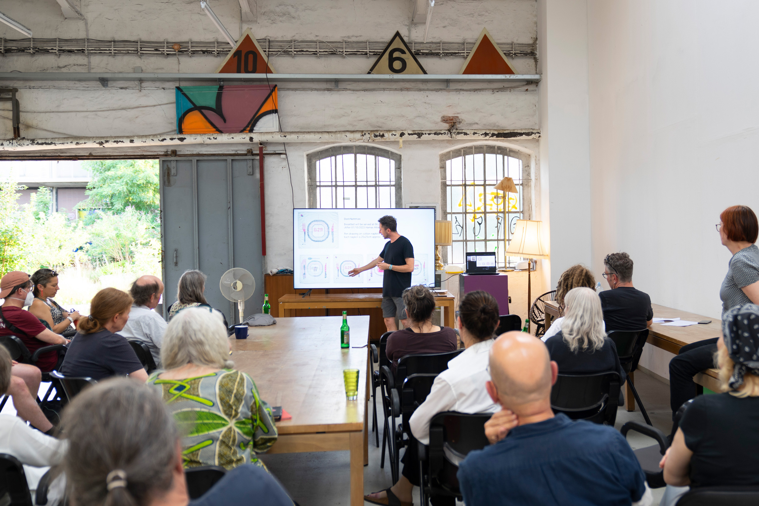 Der Künstler, Kurator und Aktivist Liav Mizrahi aus Tel Aviv war im Juli für zwei Wochen zu Gast am Güterbahnhof Bremen – Areal für Kunst und Kultur. Im Gastatelier Tor 26 hat er eine Installation aus Zeichnungen, Objekten und Eingriffen in den Ort realisiert. In zwei Veranstaltungen berichtete er über die Auswirkungen des 7. Oktober auf Kunst und Kultur in Israel stellte ausgesuchte künstlerische Positionen sowie seine eigene künstlerische und kuratorische Arbeit vor.