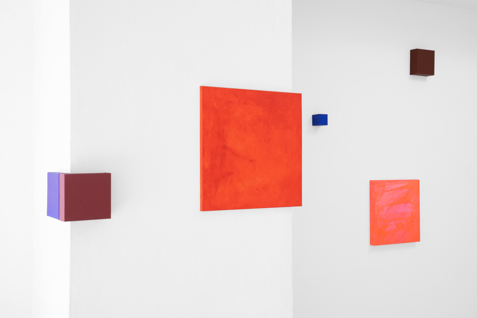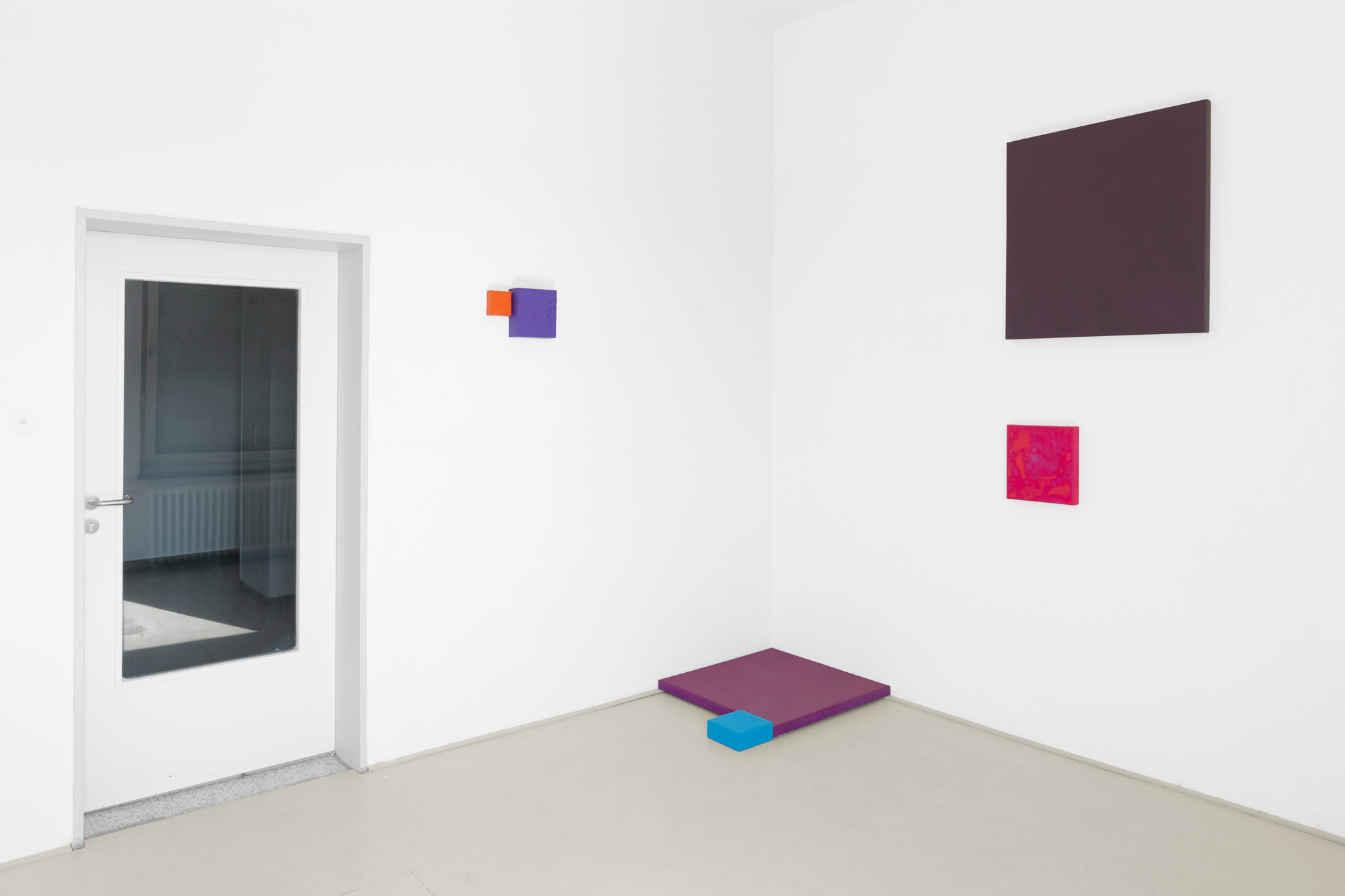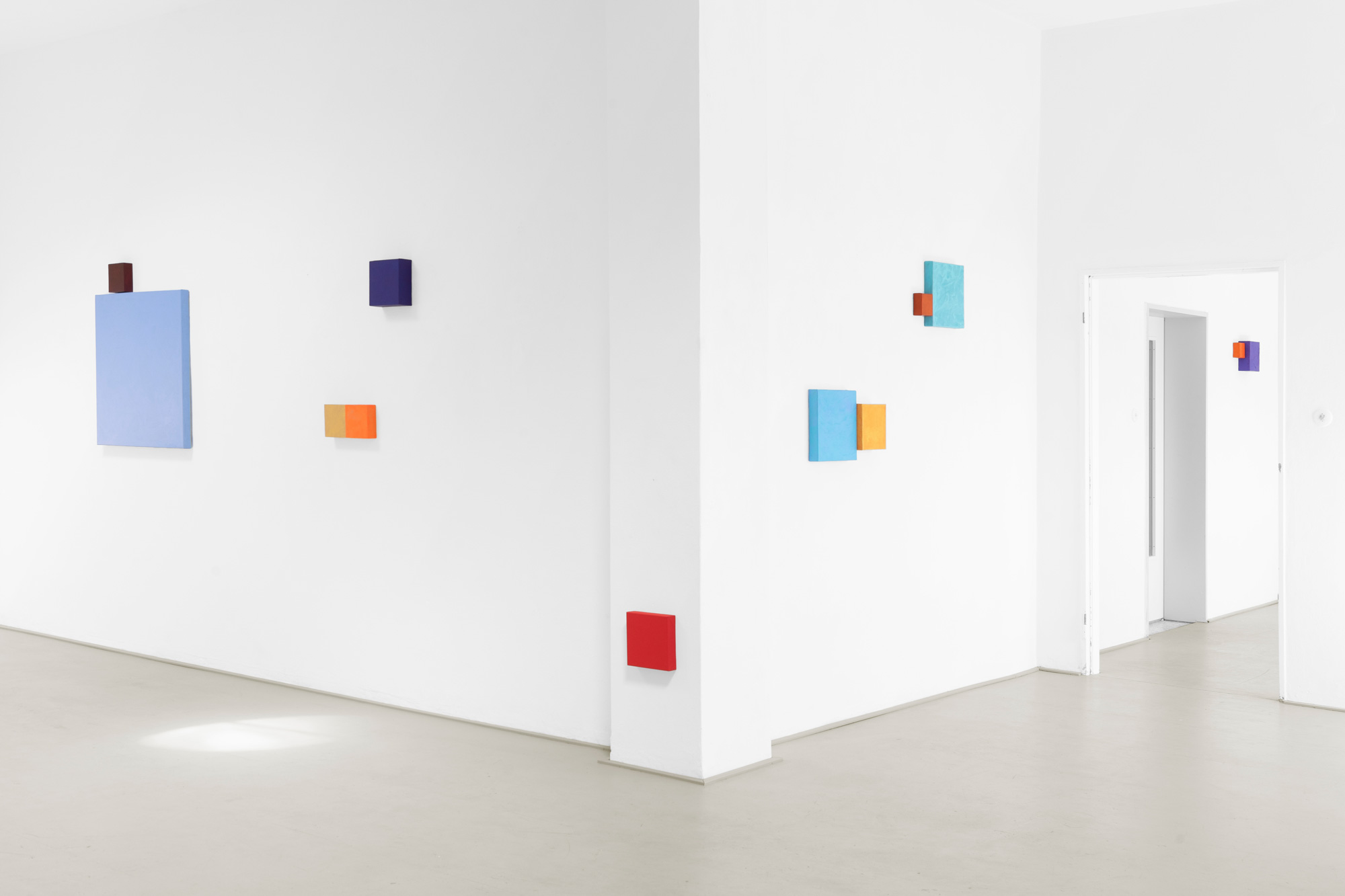Mit zahlreichen dünnen, übereinandergelagerten Farbschichten entwickelt Ulrike Brockmann ihre intensiven Farbkompositionen. Paarweise stehen sich die auf quadratischen Bildflächen unterschiedlicher Tiefe gearbeiteten Objekte gegenüber, treten in Beziehung, spiegeln sich, nehmen das Licht des Raumes auf und strahlen in ihn zurück. In ihrer Objekthaftigkeit bewegen sich die Arbeiten auf der Grenze zur Malerei.