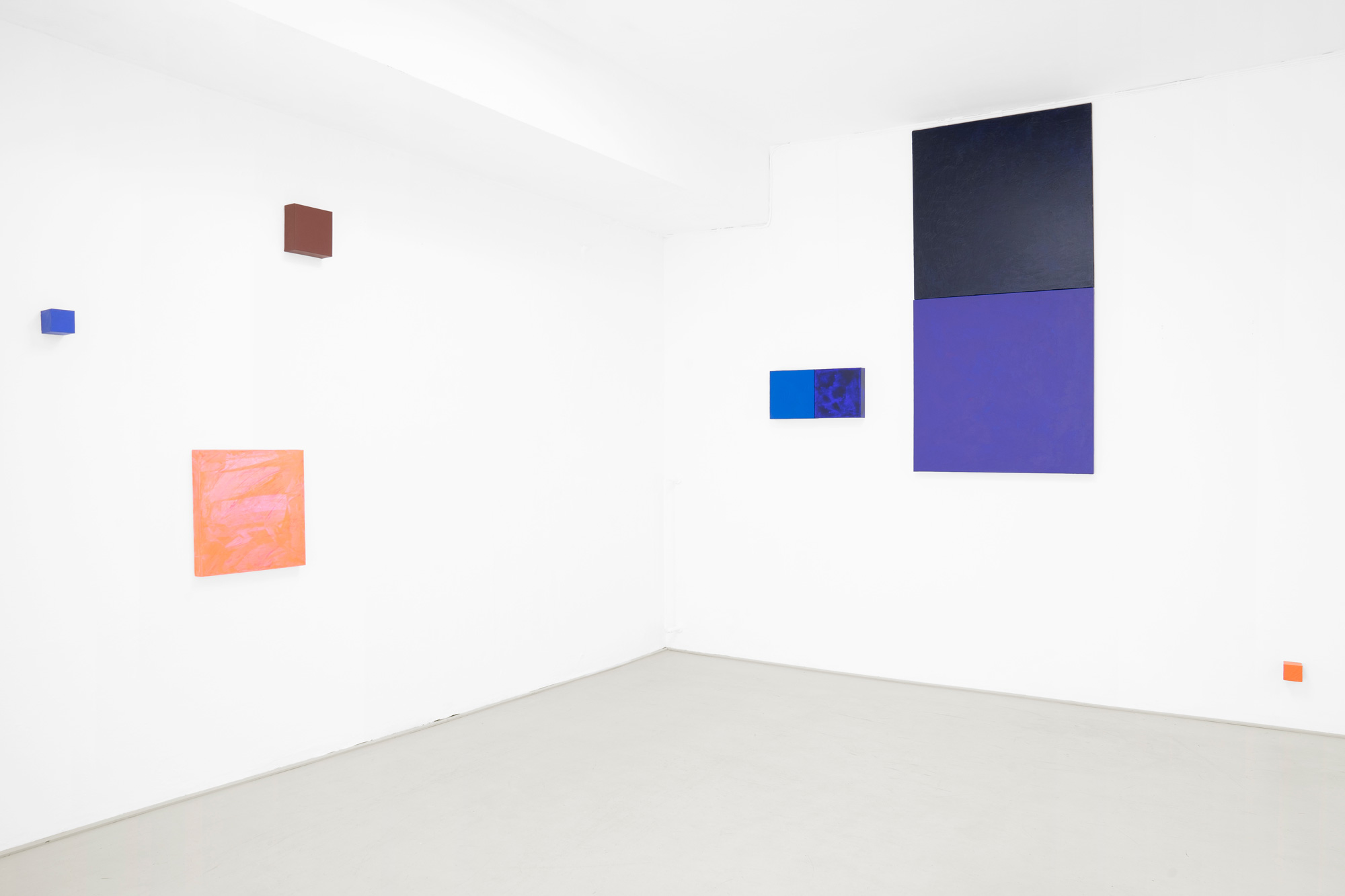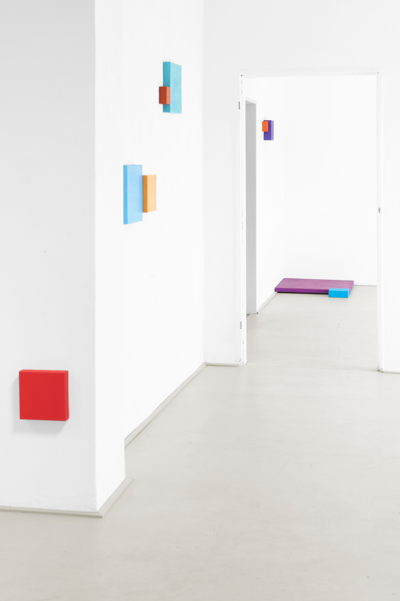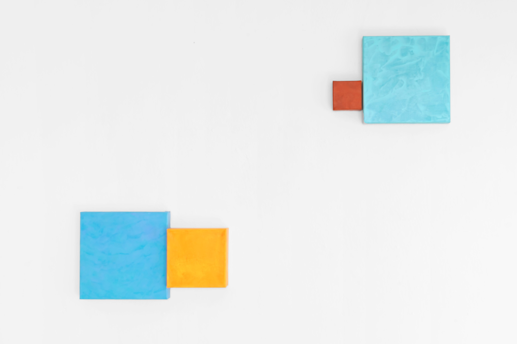 Mit zahlreichen dünnen, übereinandergelagerten Farbschichten entwickelt Ulrike Brockmann ihre intensiven Farbkompositionen. Paarweise stehen sich die auf quadratischen Bildflächen unterschiedlicher Tiefe gearbeiteten Objekte gegenüber, treten in Beziehung, spiegeln sich, nehmen das Licht des Raumes auf und strahlen in ihn zurück. In ihrer Objekthaftigkeit bewegen sich die Arbeiten auf der Grenze zur Malerei.